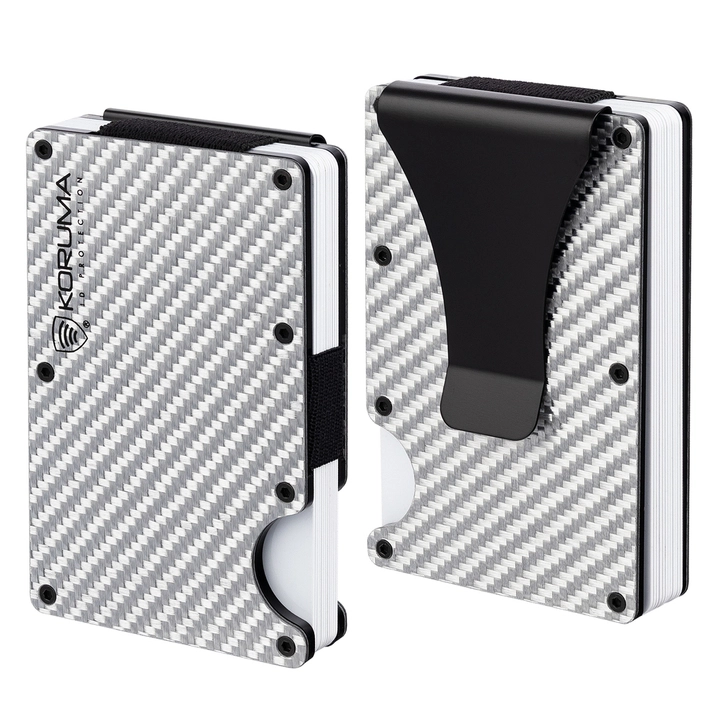 Diebstahlsicheres Kartenetui aus Aluminium mit Banknotenclip oder als Gürtelclip. Der Clip ist ein Bauteil, das durch Lösen der Schrauben mit dem mitgelieferten Schraubendreher entfernt werden kann. Die zwischen den Platten platzierten Karten werden durch stabile Gummibänder gehalten. Das Gehäuse ist auf der Außenseite mit silberfarbenem Carbon überzogen.