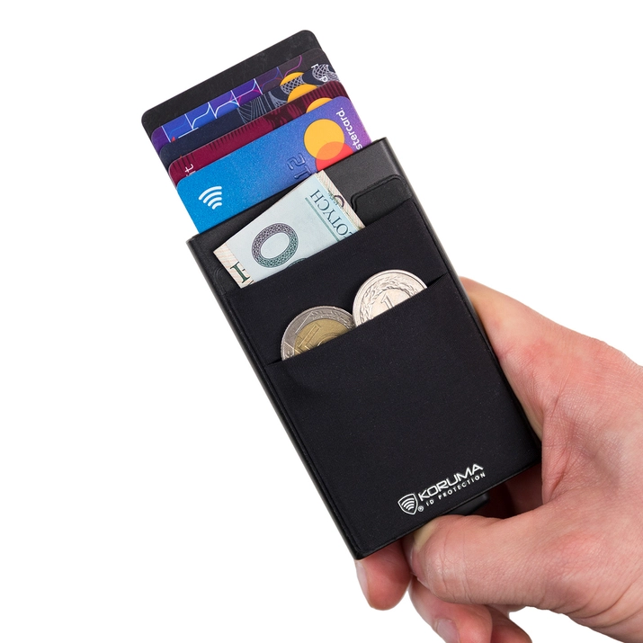 Neben dem Aluminium-Kartenetui enthält die Box auch ein flexibles Etui, das an der Aluminium-Brieftasche befestigt werden kann. Das Etui kann als Aufbewahrungsort für Geldscheine und Münzen verwendet werden.