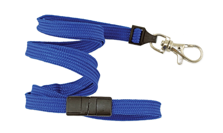 Blau gefärbtes Lanyard mit Sicherheitsvorrichtung für den Fall eines starken Zugs am Lanyard. Das Band ist aus Polyester und endet mit einem Standard-Karabinerhaken.