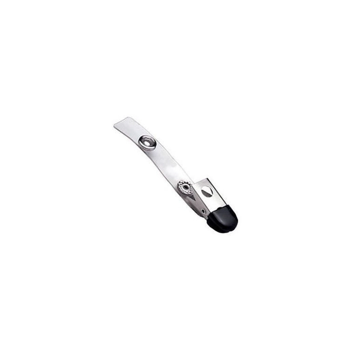 Vernickelter Metallclip/Frosch mit Gummispitzen und durchsichtigem Vinylstreifen für Ausweise. Die Gummispitzen sind rutschfest und schützen die Kleidung vor Beschädigungen.