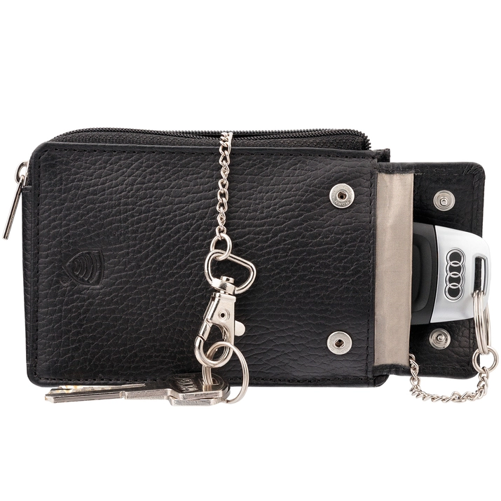 Wenn Sie Ihren Autoschlüssel in einer Klapptasche aufbewahren, minimieren Sie das Risiko, dass das vom Schlüssel ausgesendete Signal abgefangen wird. Ermöglicht wird dies durch die Verwendung eines speziellen Materials, das Funksignale unterdrückt. In der mittleren Tasche des Etuis können Sie zusätzliche Schlüssel, z.B. für Ihre Wohnung, sowie Ihre Meldekarte aufbewahren (endlich alles an einem Ort). Andererseits können Sie Ihre kontaktlosen Zahlungskarten in der externen Reißverschlusstasche sicher aufbewahren.
